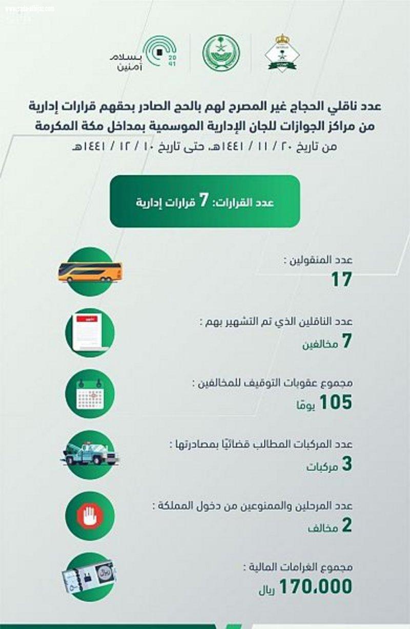 أصدرت المديرية العامة للجوازات 7 قرارات إدارية بحق ناقلي حجاجٍ غير مصرح لهم بالحج، خلال الفترة من 20 ذي القعدة 1441هـ حتى اليوم، شملت عقوبات مالية بلغت 170 ألف ريال وسجن لمدد مجموعها 105 أيام بحقهم