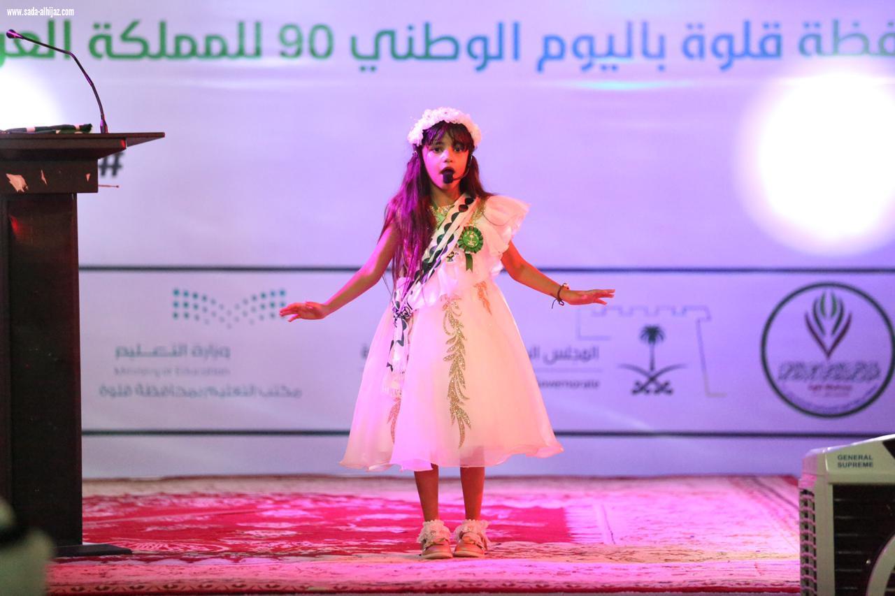 برعاية من وكيل إمارة منطقة الباحة الأستاذ أحمد بن صالح السياري احتفلت محافظة قلوة باليوم الوطني حيث دشن معرض الإدارات الحكومية والذي يتكون من أجنحة لكل إدارة وذلك بتنظيم وتنسيق من لجنة التنمية الاجتماعية بالمحافظة ومشاركة الجهات الحكومية المدنية والعسكرية حيث اطلع على ما أحتوته الأجنحة للجهات من برامج ومشروعات وبعد ذلك بدأ الحفل الخطاب بآيات من الذكر الحكيم للطالب علي بن عبدالله بالقرون.