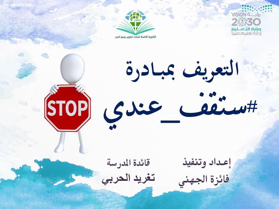 نفذّت مدرسة الثانوية الثامنة بينبع البحر اليوم الخميس برنامجاً بعنوان " ستقف عندي " للحد من الرسائل السلبية في مواقع التواصل الإجتماعي ، وأوضحت معدّة البرنامج فائزة الجهني أن البرنامج تضمن التعريف بالمبادرة وأهميتها ومدى حاجة المجتمع للتوعية عن الأضرار الناتجة من هذه الرسائل السلبية ، وما قد تسببه من تفكك وتشويه للمجتمع ، وأضافت الجهني بأن هذا البرنامج هو جزء من مبادرة أطلقتها الكاتبة والمدربة ماجدة أبو عوف بالتعاون مع مجموعة من الإعلاميين والمثقفين من أبناء هذا الوطن ، وتبنتها مؤسسة غاليه الحربي لتنفيذ الفعاليات وشبكة نادي الصحافة السعودي لتنفيذها .